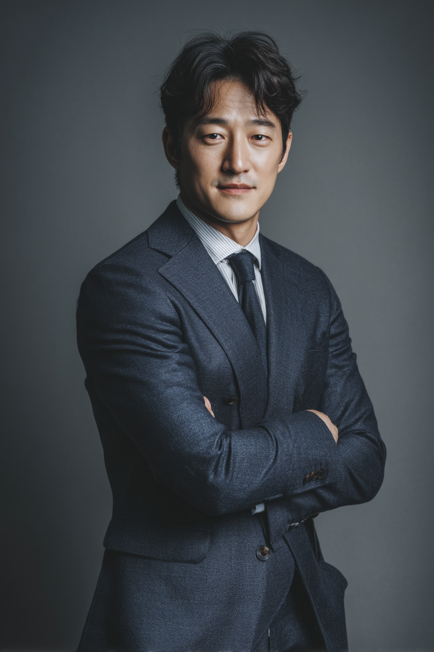 /imagine prompt: Professional portrait of 30 year old Korean businessman, confident expression, navy suit, clean gray background, studio lighting, shot on Canon EOS R5 85mm f/1.4, ultra sharp focus, photorealistic, natural skin texture --ar 2:3 --style raw --q 2 --v 7 --no glasses
